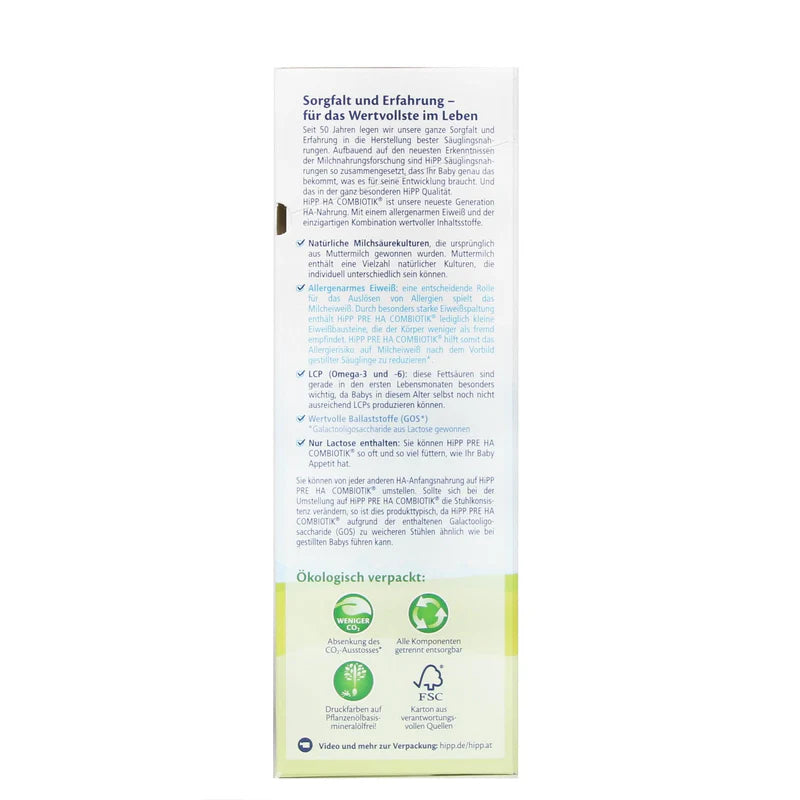 HiPP Hypoallergenic Combiotik Stage Pre formula is suitable from birth and is ideal for supplementing with breast milk or for exclusive bottle-feeding. HiPP infant formula is specifically tailored to meet the needs of children who are at risk of allergies, as milk protein is one of the most common allergens. HiPP HA is formulated with enzymes that break down the milk protein, which makes it less foreign to a baby’s system and easier for them to digest. Along with hydrolyzed proteins, this formula has an outstanding composition of ingredients founded on years of scientific research to ensure it contains all the nutrients your baby needs for a healthy development. HiPP HA formula is made with essential minerals and vitamins, such as iron, Vitamin A, C, and D. Vitamin D is essential for calcium absorption and bone growth. In addition to vitamins, it contains prebiotics and probiotics, which promotes healthy digestion, aids in a healthy gut flora, and helps maintain an overall healthy immunity. The probiotics are derived from natural lactic acid cultures that are found in breast milk. HiPP HA formula also contains long chains of polyunsaturated fatty acids, Omega 3 & 6 LCPs (DHA & AA), that are important for brain and eye development.
